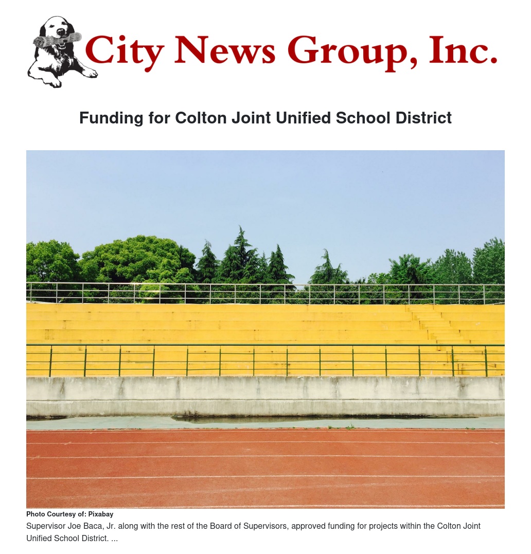 On Tuesday, August 23rd Supervisor Joe Baca, Jr. along with the rest of the Board of Supervisors approved funding for projects that will be located within the Colton Joint Unified School District. This action is in response to the American Rescue Plan Act - Coronavirus Local Fiscal Recovery Fund Subrecipient Contracts in accordance with the approved Coronavirus Local Fiscal Recovery Funding Spending Plan. The approved item will provide both Bloomington High School baseball and softball fields, and Joe Baca Middle School’s soccer field improvements and project plan to promote exercise by providing the students and the community better opportunities to access quality outdoor recreational spaces.