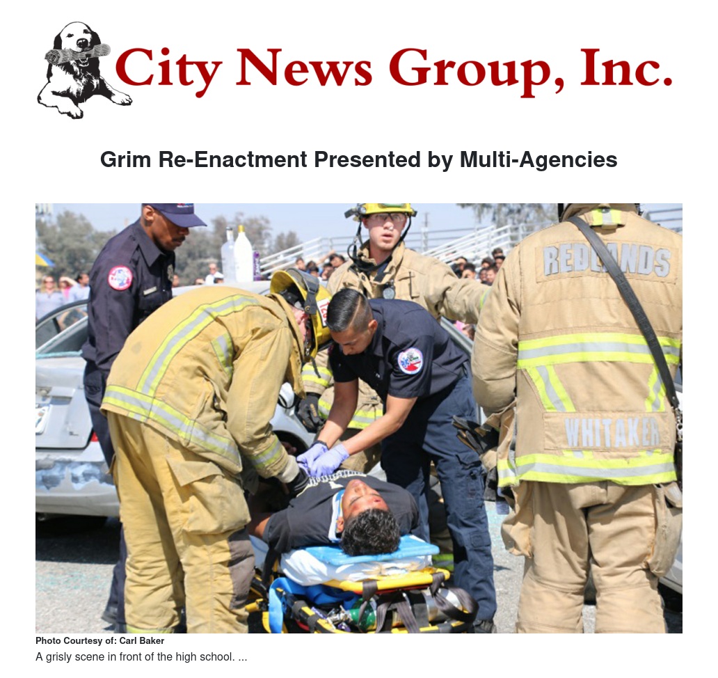 “Every 15 Minutes” was sponsored by the San Bernardino County Sheriff. In addition to the Redlands Police and Fire Departments, partners included: the Automobile Club of Southern California, Jose's Mexican Food, Cucas Mexican Food, Hogi Yogi, Holiday Express, Dr Baljinder S. Grewal, Emerson and Bartlett Mortuary, Pepe's Towing and Above the Stem Florists.