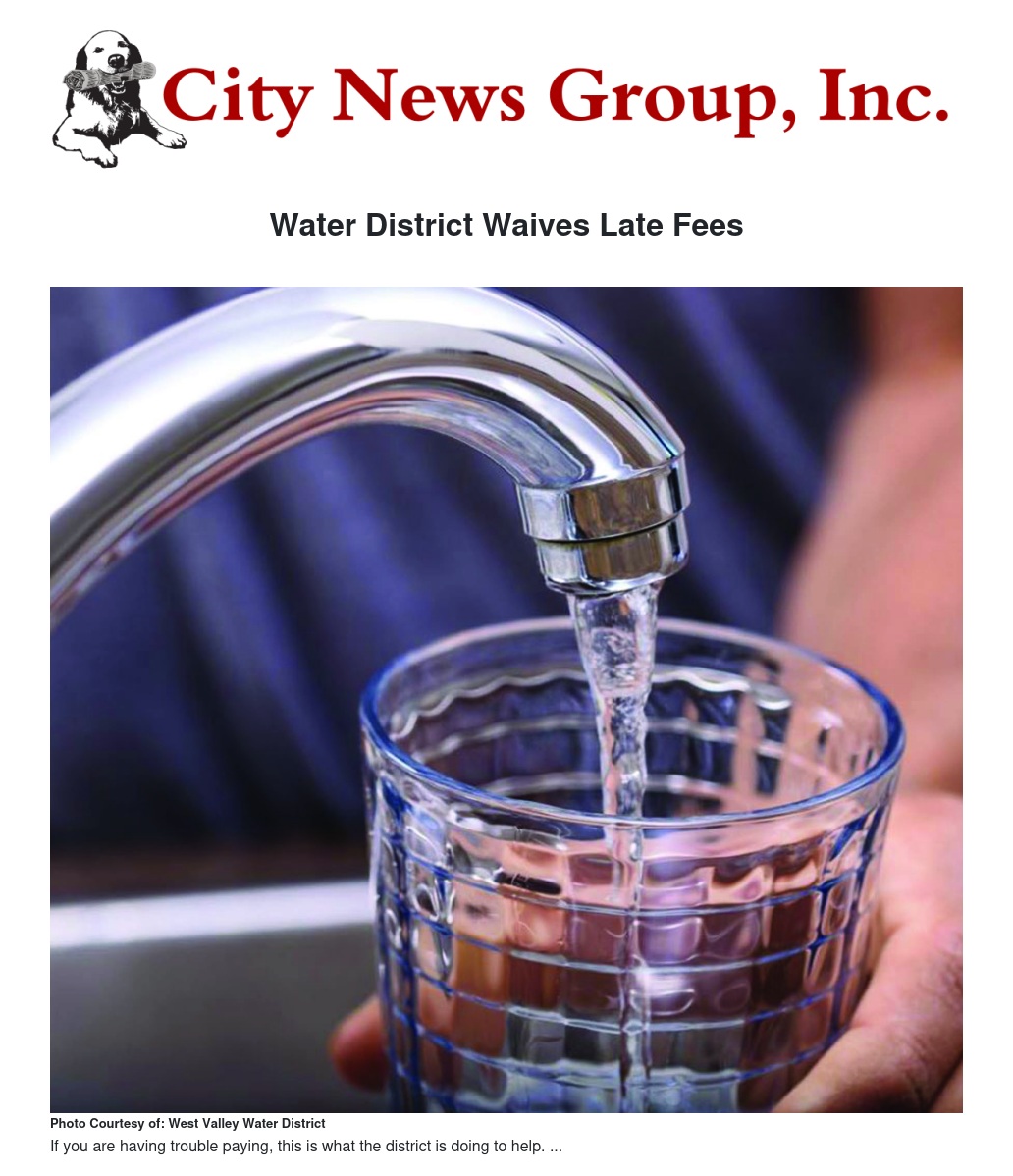 The West Valley Water District (WVWD) Board of Directors approved a resolution waiving late fees for water services during the local state of emergency due to the coronavirus disease (COVID-19) pandemic.