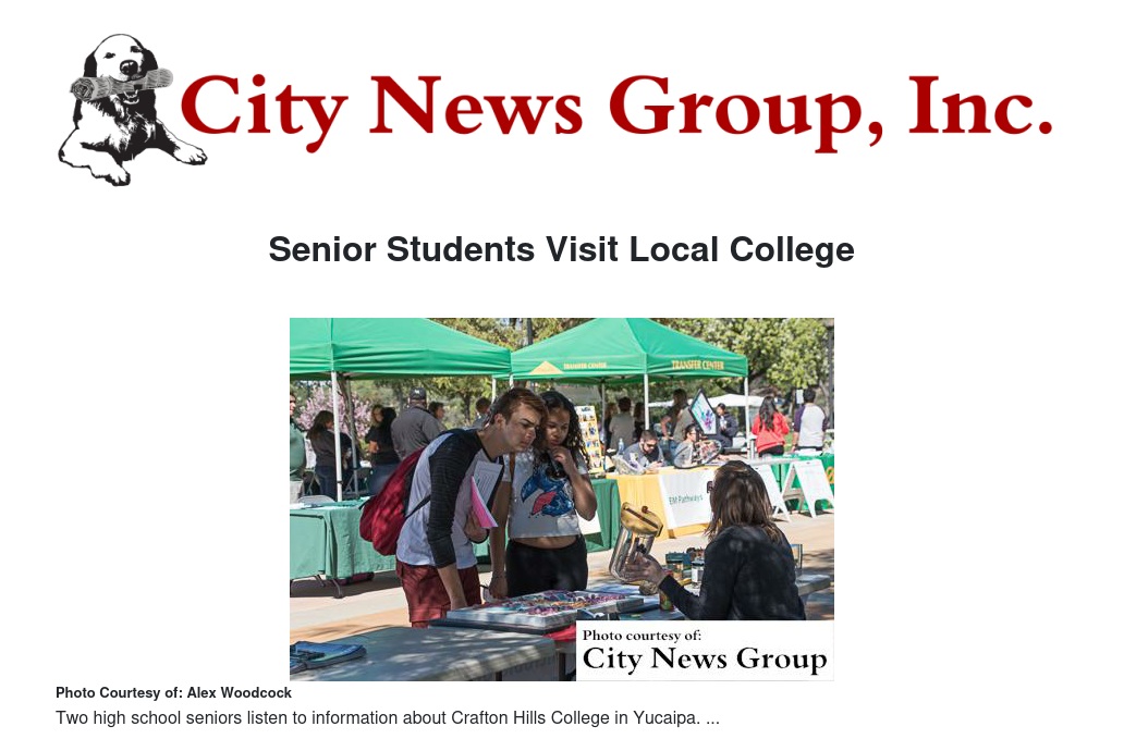 Beaumont, Big Bear, Citrus Valley, Colton, Glen View, Green Valley, The Grove, Mesa Grande Academy, Orangewood, Pacific, Redlands East Valley, Redlands, Rim of the World, San Andreas, San Gorgonio, Sierra, Slover Mountain, Springs Charter and Yucaipa high schools sent more than 900 students to Crafton Hills College to participate in workshops, take a campus tour and have lunch.