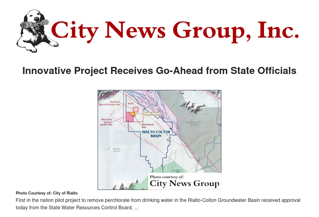 Perchlorate - both a naturally occurring and man-made chemical used in rocket fuel, fireworks, flares, and explosives – is present in the Rialto-Colton Groundwater Basin and attributed to past