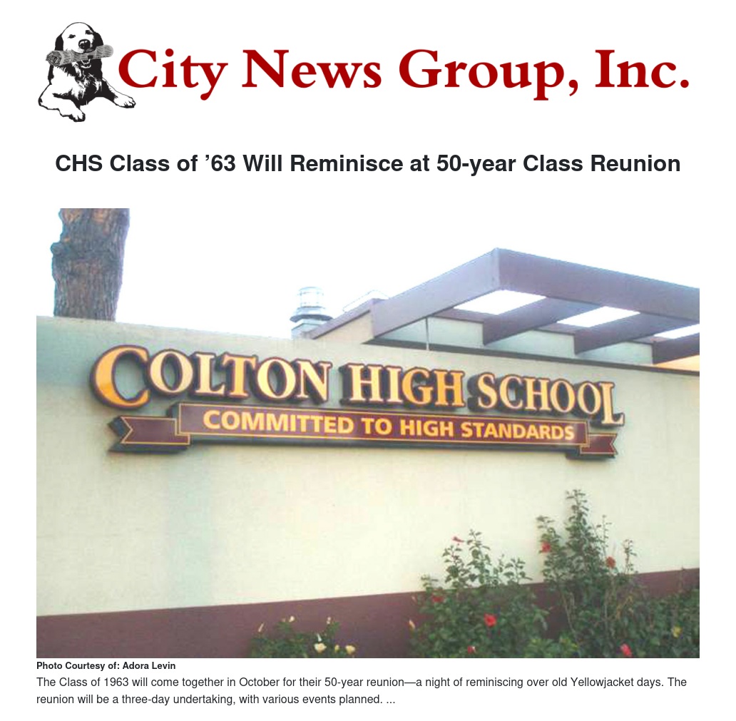 Colton High School’s (CHS) class of 1963 will commemorate its 50-year reunion Oct. 19 when fellow Yellowjackets reunite from 6 p.m. to midnight at the Riverside Marriott Hotel & Resort, located at 3400 Market St. in Riverside. Additionally, a no-host reception will take place on Oct. 18 from 5 to 9 p.m. at Heroes Bar and Grill, 3397 Mission Inn Ave., Riverside.