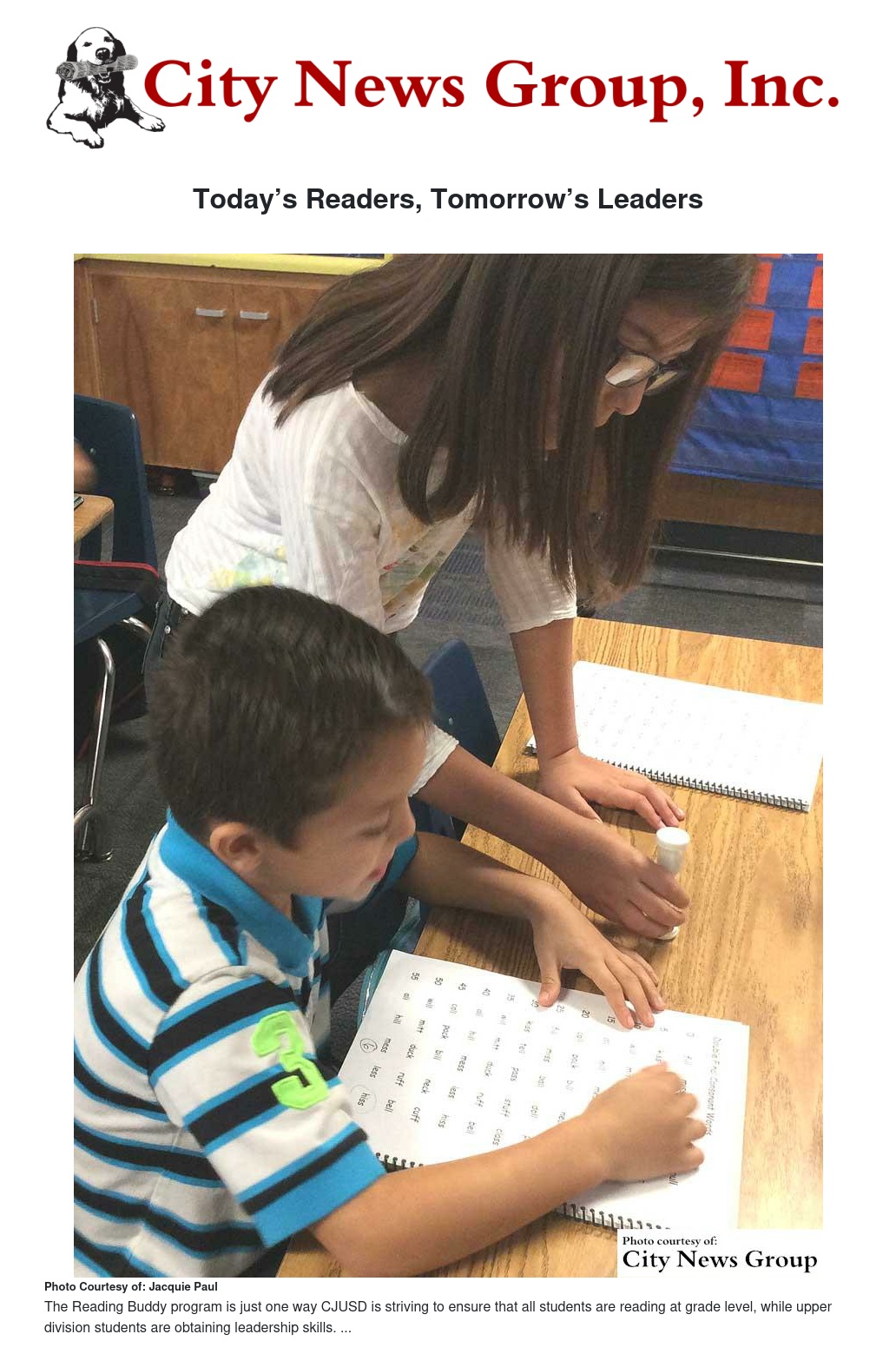 The Reading Buddy programs are just one way CJUSD is striving to ensure that all students are reading at grade level by third grade. Early literacy is a priority for the district, which has adopted the theme: “Today’s Readers, Tomorrow’s Leaders.”