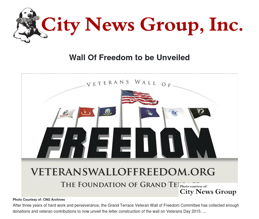 After three years of hard work and perseverance, the Grand Terrace Veteran Wall of Freedom Committee has collected enough donations and veteran contributions to now unveil the letter construction of the wall on Veterans Day 2015.