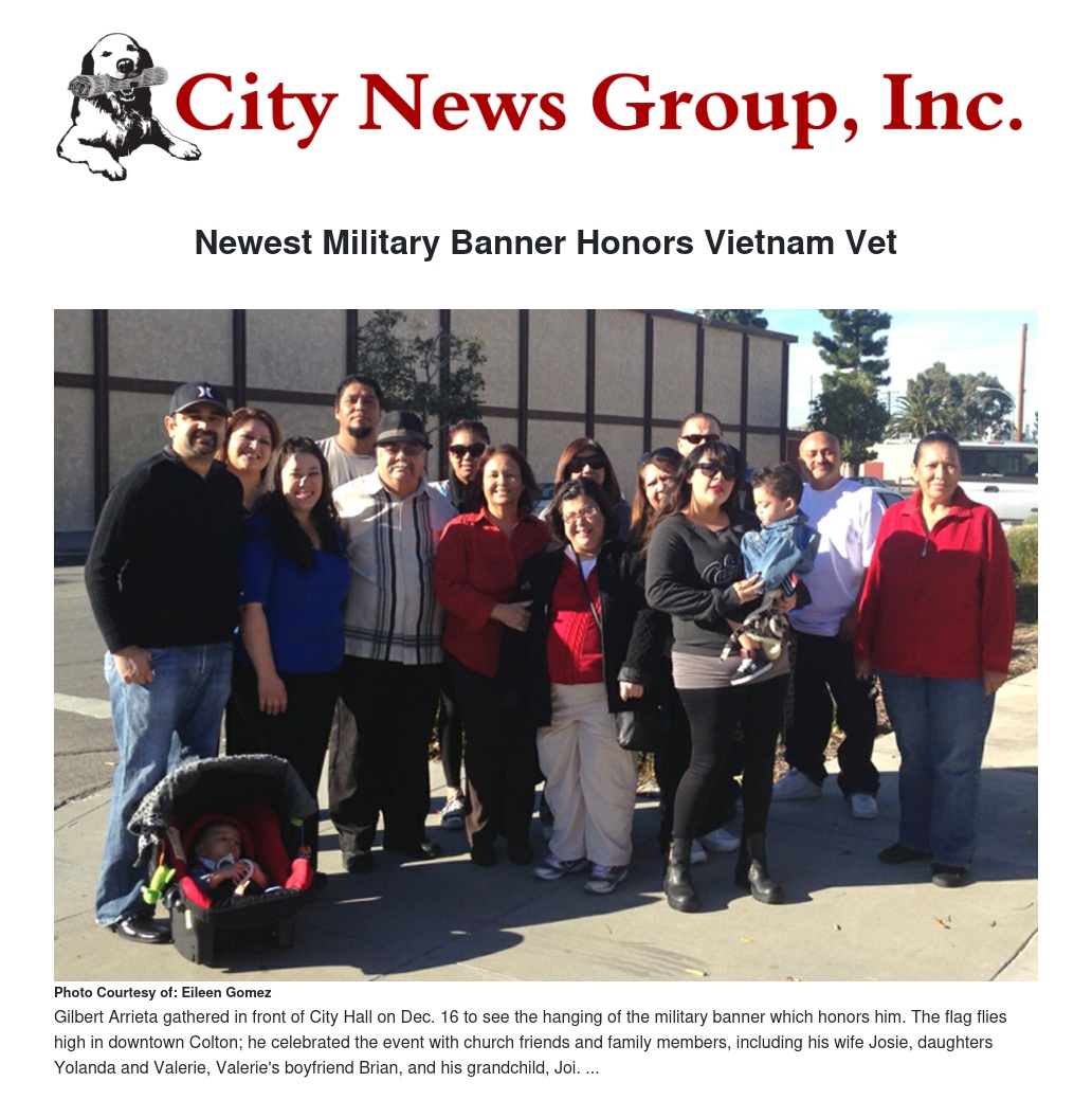Gilbert Arrieta served in the United States Army from May 1970 to Nov. 1971, where for 13 months he fought in Vietnam. Though he's always been proud of his service, the veteran felt a burst of pride on Monday when he was joined by family and friends as they watched city workers install the banner on La Cadena Ave., near City Hall.