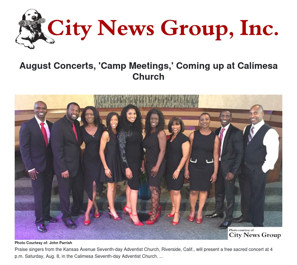 Riverside’s Kansas Avenue Seventh-day Adventist Church Praise Singers will be featured at 4 p.m. on Aug 8 and Pierre van der Westhuizen, international recording artist and concert tenor from South Africa, at 5 p.m. on Aug. 22. Singers from the Kansas Avenue choir and Westhuizen will also participate in the morning worship services on the day of their respective afternoon concerts.