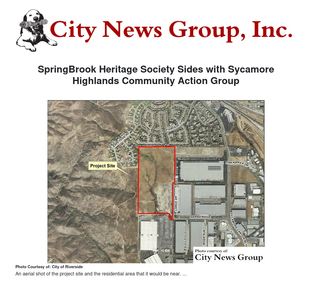 COLTON>> SpringBrook Heritage Alliance (SHA), an organization whose main objective is saving the natural, historical areas of the North Side of Riverside, South Colton, Highgrove and Southeast Grand Terrace, had recently taken a vote on whether to support the Sycamore Highlands Community Action Group fight to stop the mega-warehouses and other industrial development from moving into residential areas.