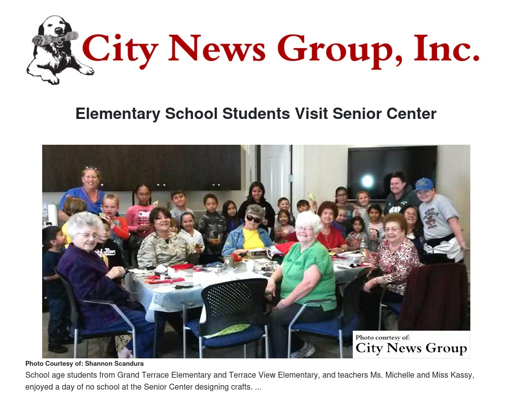 On Tuesday, Nov. 17 between 9:30 - 10:15 a.m, around 20 students from two elementary schools, Grand Terrace Elementary and Terrace View Elementary, school age children from the City of Grand Terrace Child Care, visited the Grand Terrace Senior Center to color and design their own holiday crafts.