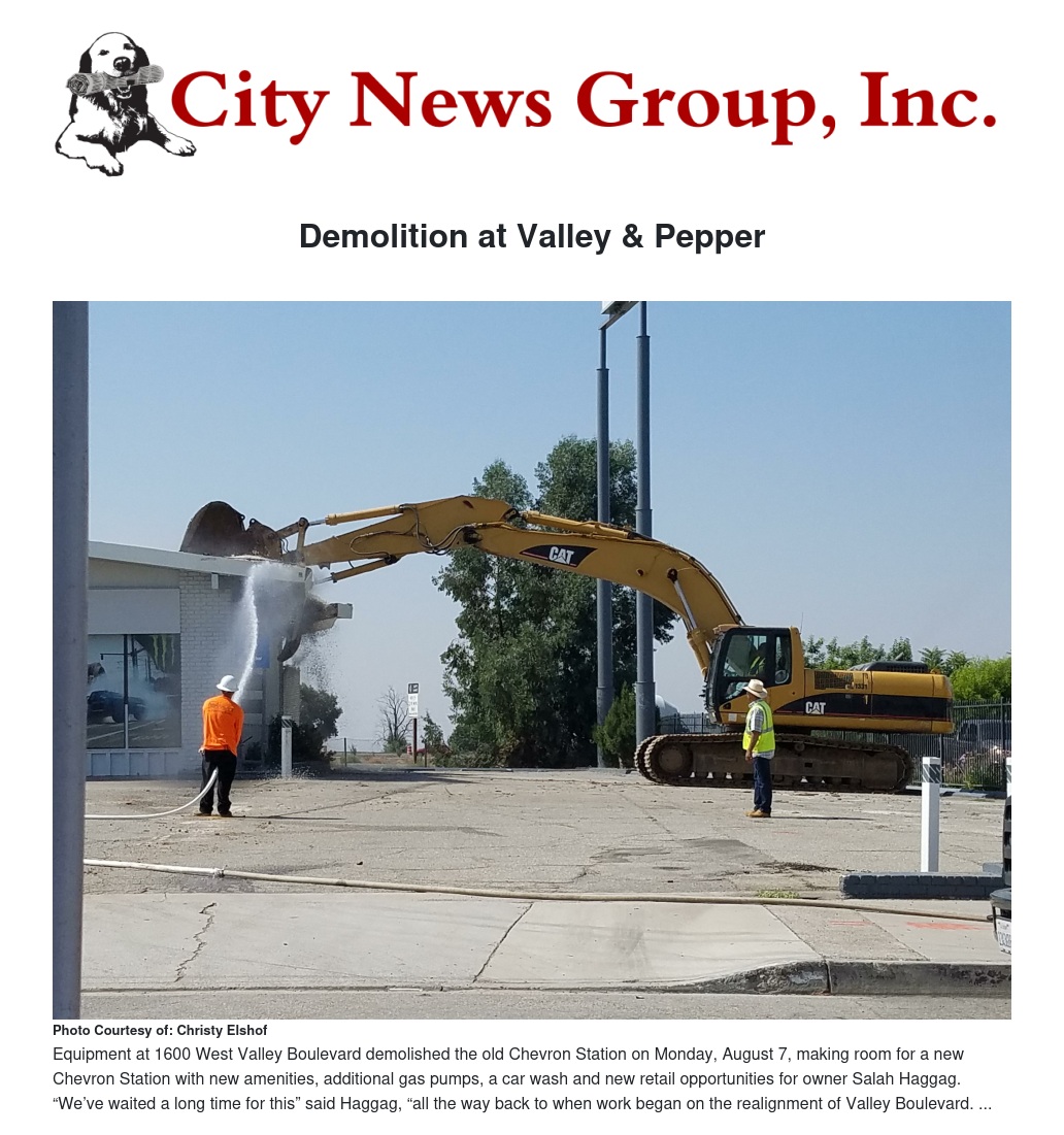 Equipment at 1600 West Valley Boulevard demolished the old Chevron Station on Monday, August 7, making room for a new Chevron Station with new amenities, additional gas pumps, a car wash and new retail opportunities for owner Salah Haggag. “We’ve waited a long time for this” said Haggag, “all the way back to when work began on the realignment of Valley Boulevard. We’re ready to build a new building and bring new business and synergy to the area near the Arrowhead Regional Center (ARMC).
