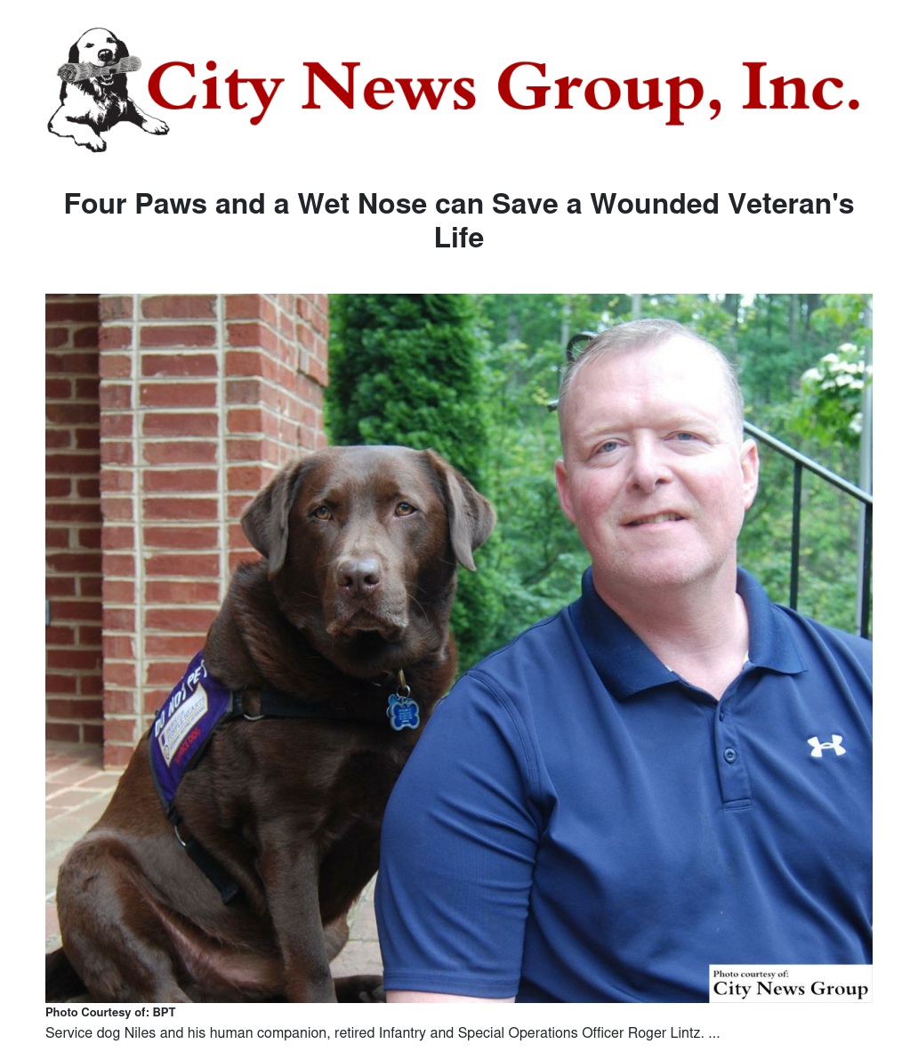 In February 2012, while between surgeries, the father of two was paired with Niles, a 5-year-old, 100-pound chocolate lab, by Paws for Purple Hearts. The non-profit organization trains and provides service dogs free of charge to veterans with physical disabilities and PTS. The group is one of the many veterans' organizations supported by the Purple Heart Foundation, the fundraising arm of the Military Order of the Purple Heart. The foundation also supports other non-profits that provide service dogs to wounded veterans, such as NEADS.