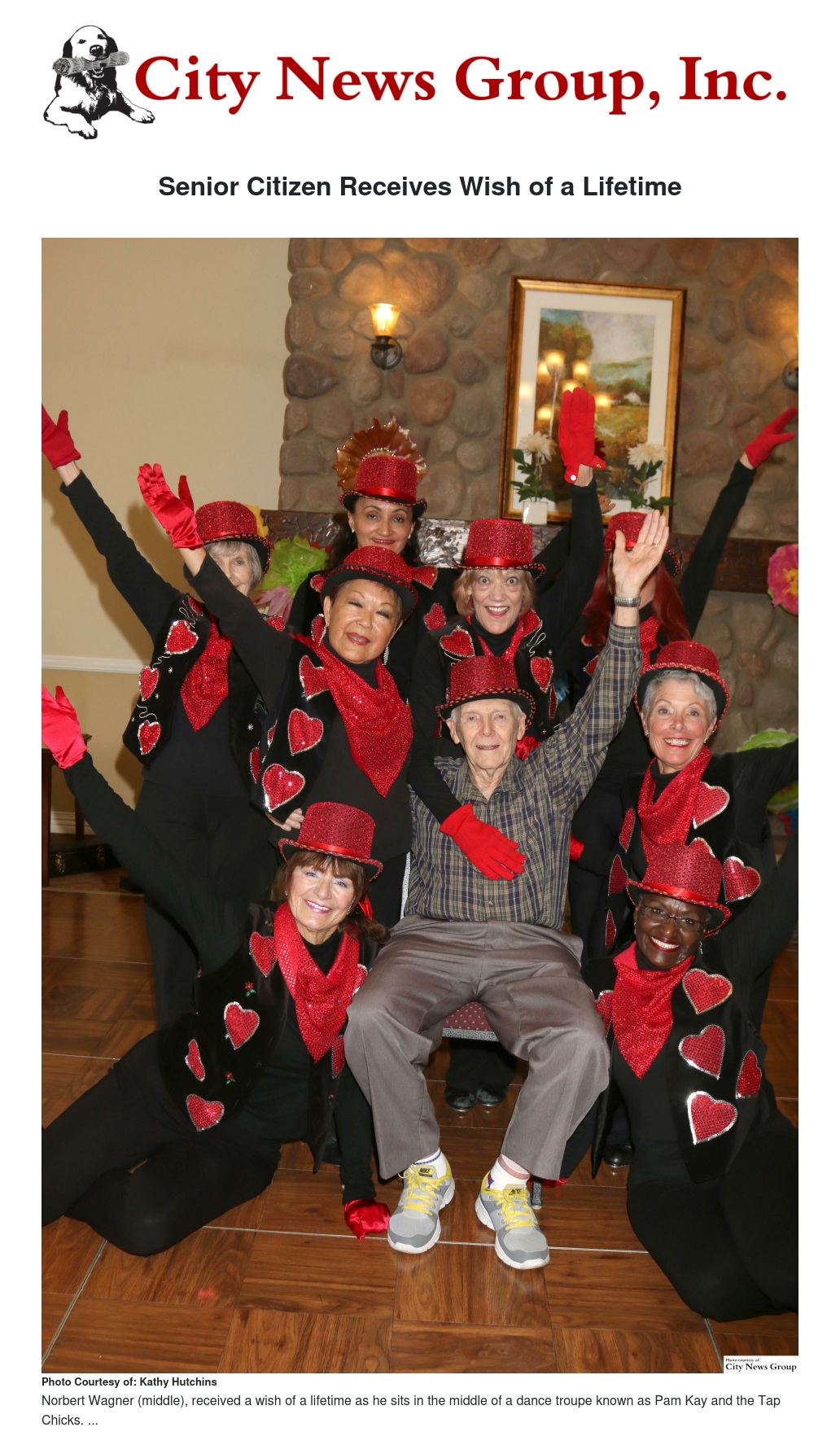 The Tap Chicks are a dance group from the Pasadena Senior Center taught by Pam Kay, a professional entertainer who once opened for Sammy Davis Jr., and has been creating tap and jazz infused Broadway-style dance routines to help promote longevity and quality of life through dance.