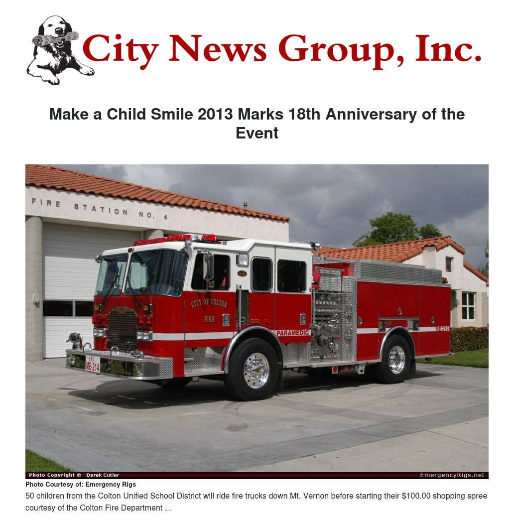 All of the children were transported via school bus to Fire Station 211 at approximately 8:50 a.m Dec. 17. From there they boarded fire engines and drove, with lights and sirens on, down Mt. Vernon to the Walmart at 1120 S. Mt. Vernon. Santa Claus and city officials led the way while the Colton Police Department blocked the streets. Each child was then escorted by a firefighter around the store to spend their $100 on whatever they wanted. McDonalds provided lunch to every student following the shopping spree.