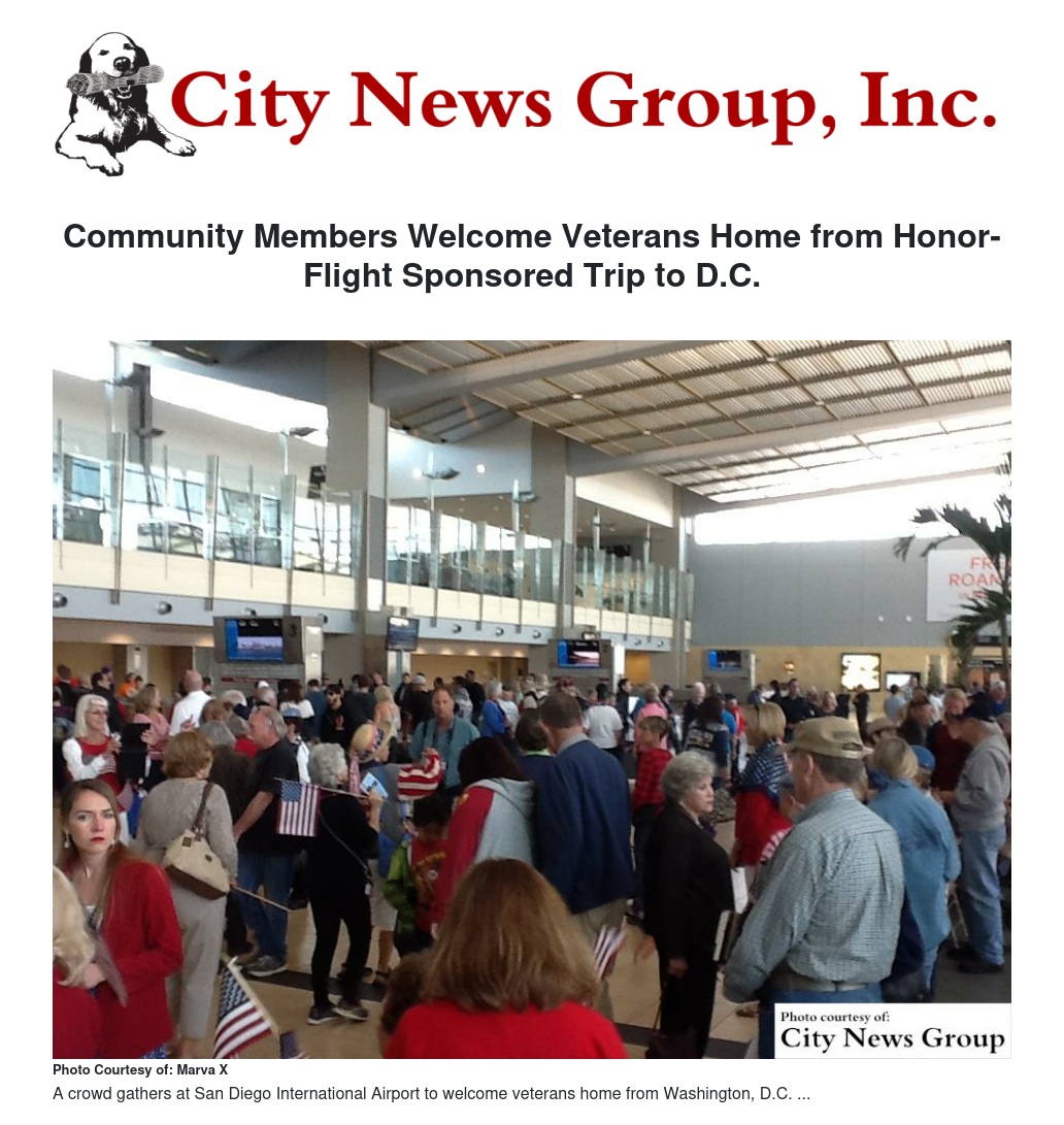 This year, 23 local veterans returned to a welcoming crowd at the San Diego International Airport May 1. Another 21 will return to the Ontario International Airport June 12. People are welcome to gather at 12:30 p.m. with flags and signs of appreciation to welcome the Greatest Generation home.