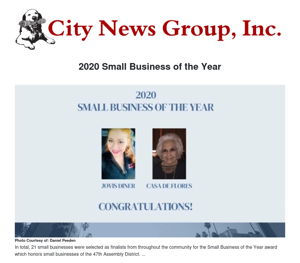 In total, 21 small businesses were selected as finalists from throughout the community for the Small Business of the Year award which honors small businesses of the 47th Assembly District. “Congratulations Jovi’s Diner and Casa De Flores for being chosen as the 2020 Small Businesses of the Year for the 47th Assembly District. And congratulations as well to our finalists selected from the many nominations,” said Assemblymember Reyes. “Small Businesses are the backbone of our economy. Together we must renew our commitment to small businesses in the State of California because as they thrive so do our local economies.”