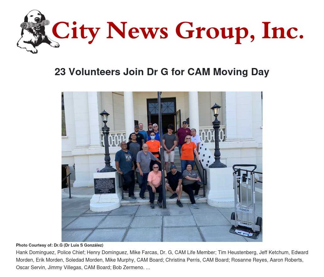 Police Chief, Hank Dominquez, offered an excellent description of the volunteer effort, “Teamwork makes the Dreamwork.” The Chief, along with his son, Henry Jr, were the first two volunteers reporting for duty and helped to set up a process that worked like a smooth-running machine. “We are certainly grateful so many people came to help,” commented Dr. G, who quickly wanted to list the names of all the helpers. They were; Hank Dominguez, Police Chief; Henry Dominguez, Mike Farcas, Dr. G, CAM Life Member; Tim Heustenberg, Jeff Ketchum, Edward Morden, Erik Morden, Soledad Morden, Mike Murphy, CAM Board; Christina Perris, CAM Board; Rosanne Reyes, Aaron Roberts, Oscar Servin, Jimmy Villegas, CAM Board; Bob Zermeno, plus seven CFD firefighters.