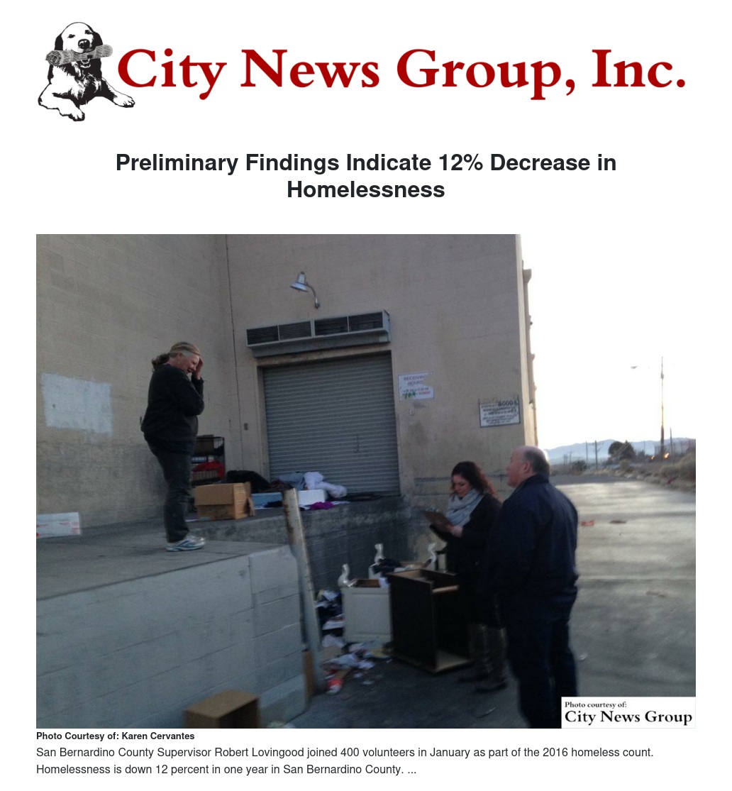 "Last year, the Board of Supervisors set the goal of ending veteran homelessness in San Bernardino County, and we met that goal by year’s end," Lovingood said. He noted that the previous countywide survey showed an 8 percent decline in homelessness.
