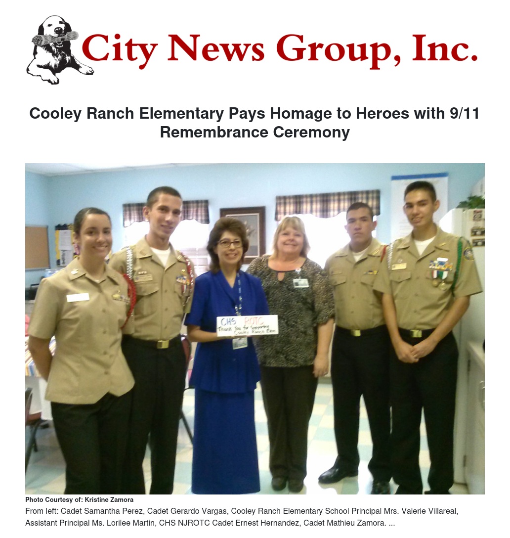 Cooley Ranch Elementary School Principal Valerie Villareal spoke to the students about the weight of the events that happened more than a decade ago, which claimed nearly 3,000 American lives. There was also a presentation of photographs drawn by the Cooley Ranch Kiwanis Kids, an extension of the adult Cooley Ranch Kiwanis Club, which depicted their version of the September 11, 2001 attacks. The school choirs also led the students in patriotic songs and the singing of the National Anthem, Villareal said.