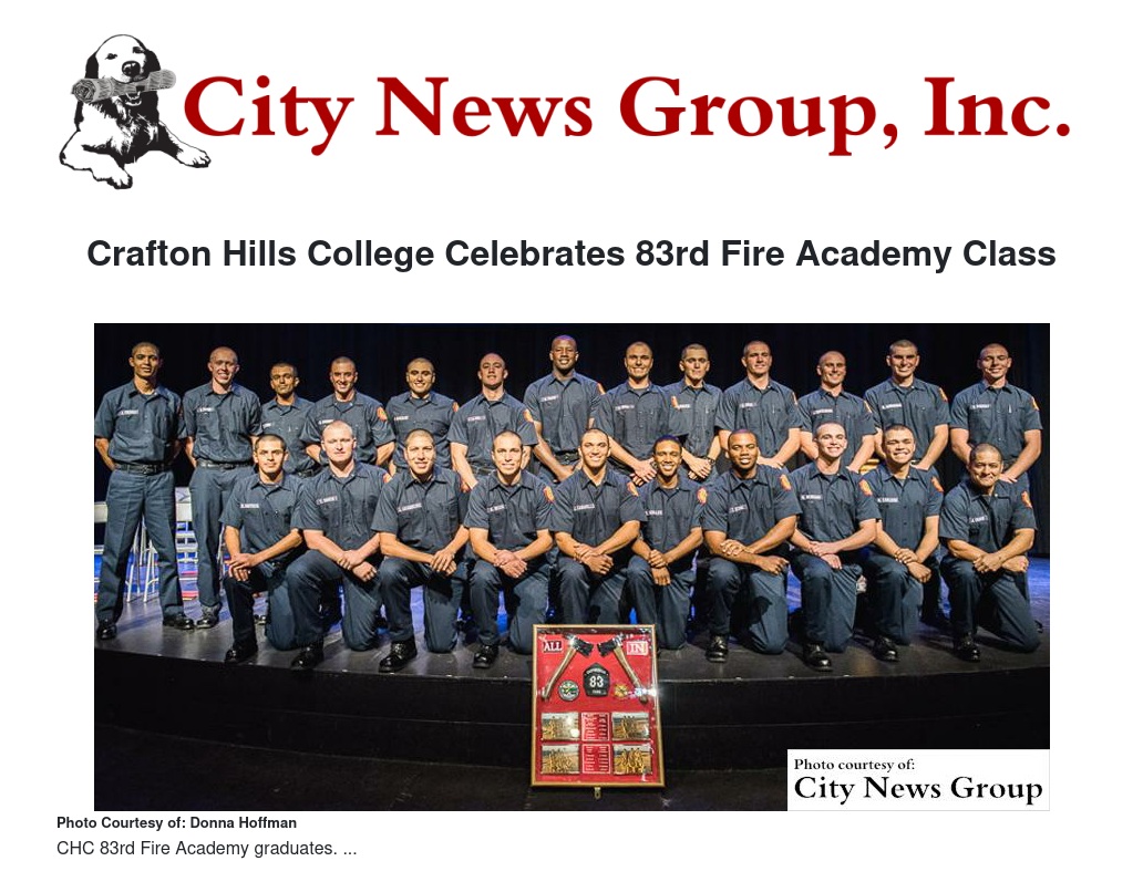 The 24 83rd Fire Academy graduates are: Jesse Aramburo (Riverside), Tanner Baker (Beaumont), Oscar Bautista Moreno (Cedar Glen), Robert Camarena (Yucaipa), Joseph Camarillo (Corona), Nick Carlson (Redands), Zachary Cruz (San Bernardino), Kyle Darby (Highland), Marcus Davis (Grand Terrace), Jason Duran (Colton), Jovan Fierro (Highland), Ismael Gonzalez (Colton), Joseph Ico (Redlands), Trevon Morales (San Bernardino), Bryan Morgan (Ontario), Vincent Piccoli (Riverside), Gaurav Singh (Lake Forest), Jacob Sokolowski (Montclair), Terrence Stone (Rialto), Anthony Vasquez (Ontario), Nicholas Vega (Fontana), Chad Whinery (Rancho Cucamonga), and Ryan Wood (Rancho Cucamonga).