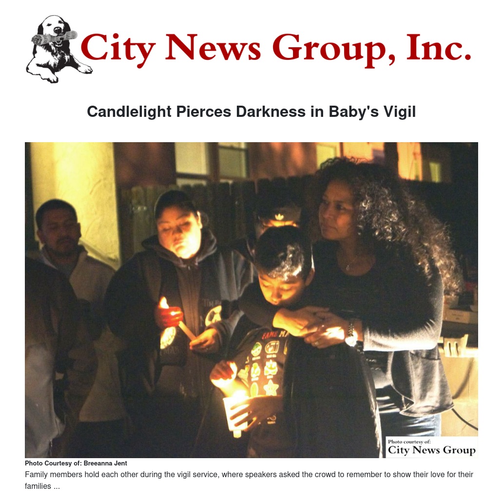 About 75 locals gathered at Seventh and B streets in Colton, in front of the old Evans Market, on Jan. 14 in a candlelight vigil organized to honor a baby boy found dead near a trash can at this spot on the morning of Jan. 2. The child, who Colton police estimated was no older than two weeks old at the time of his death, was found clothed and wrapped in a blanket by a resident who was walking the family dog that morning.