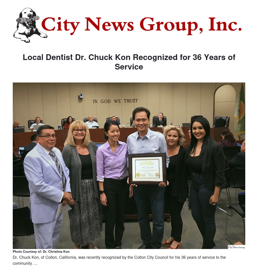 COLTON>> Dr. Chuck Kon, of Colton, California, was recently recognized by the Colton City Council for his 36 years of service to the community.