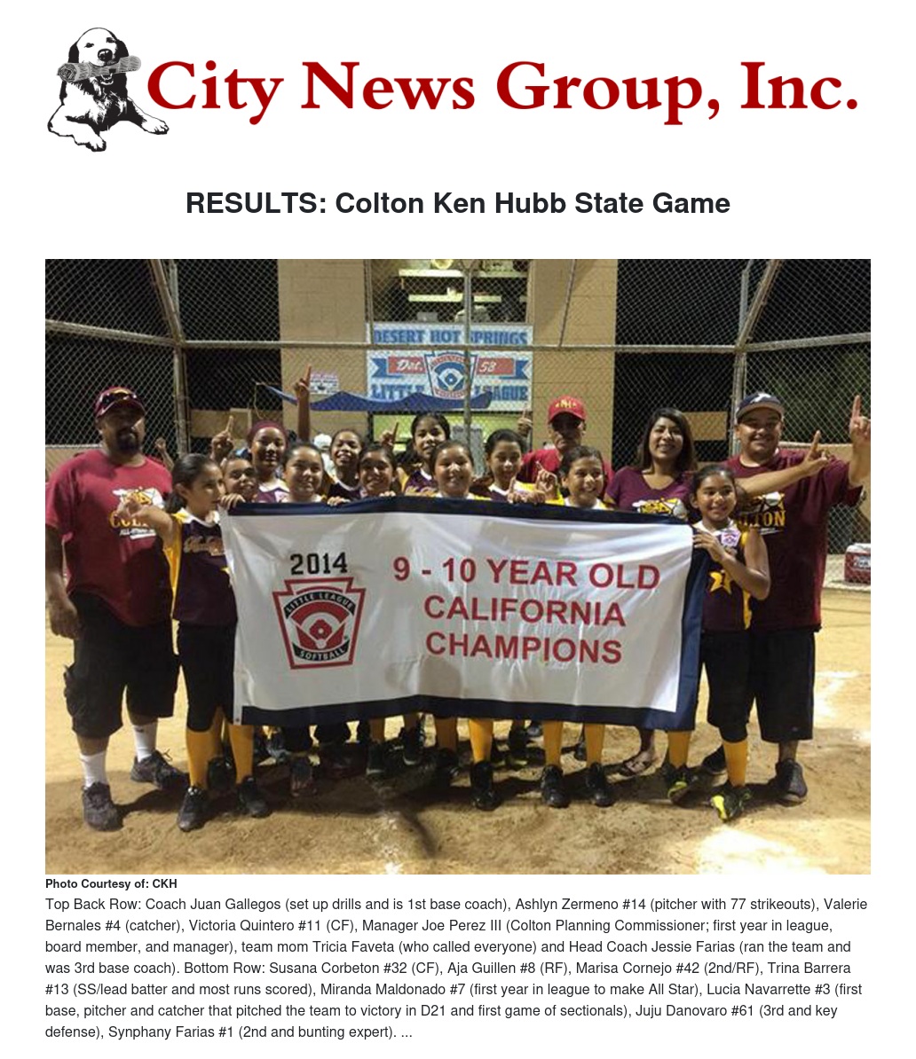 Colton Ken Hubb’s 2014 9-10 year old Allstar Team concluded their season with 10 wins, 1 loss in taking the championship in District 21, Section 8 and Division 3 of Southern California State.