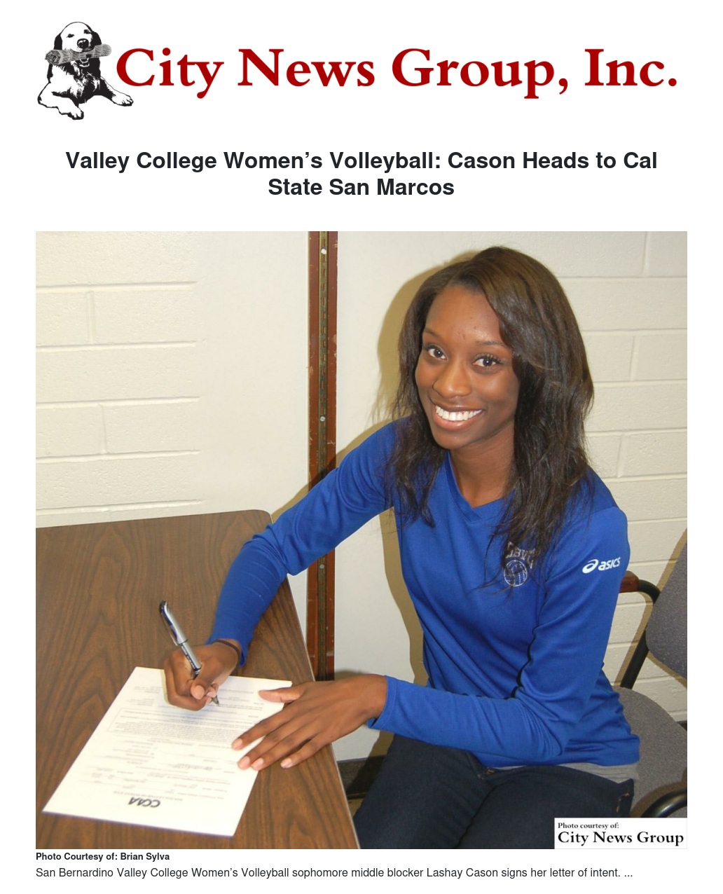 San Bernardino Valley College Women’s Volleyball sophomore middle blocker Lashay Cason (Fontana Summit) has signed a letter of intent to play for California State University San Marcos next season.
