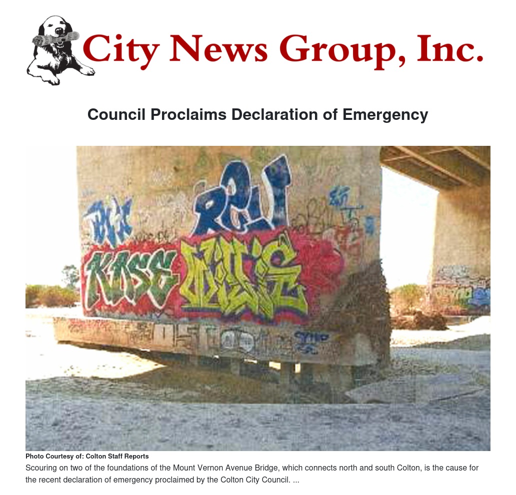 The declaration was made after the city closed down the Mount Vernon Avenue Bridge running over the Santa Ana River south of Interstate 10, connecting north and south Colton, on Aug. 14 due to “severe scouring on two of the foundations,” according to staff reports.