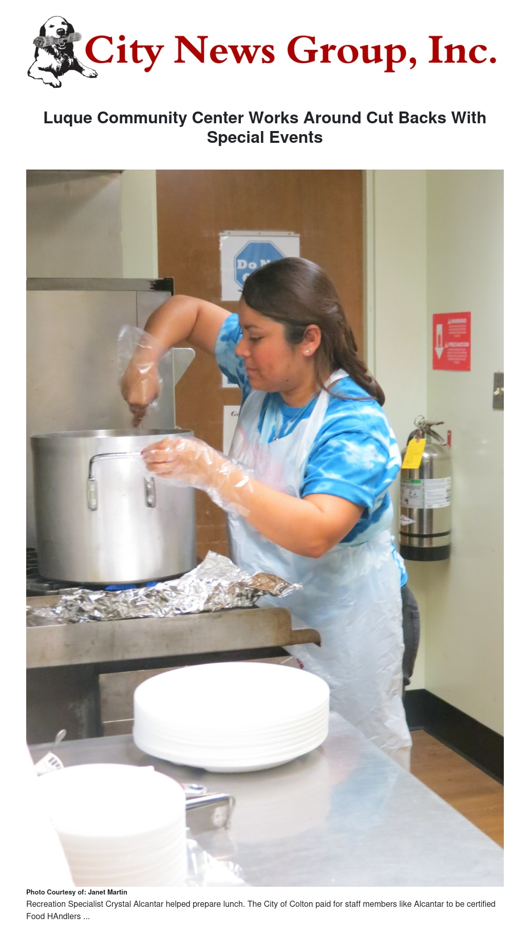 During these events, staff at the Luque Community Center prepare and serve the food and donations from the seniors help fund the costs. The city of Colton paid for food handling classes so everyone on staff is certified as official food handlers.