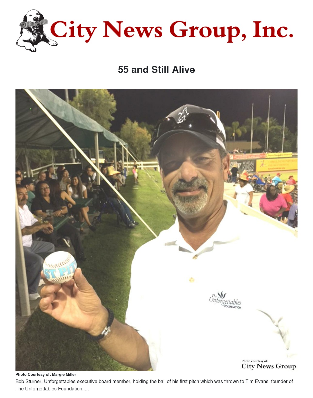 Sturner, surrounded by family and friends at the 66ers game, threw out the first pitch last Saturday night and continued a tradition started by Margie Miller, a Grand Terrace realtor, to raise $5,500 for The Unforgettables Foundation. Her double nickel birthday party was followed by The Unforgettable Foundation Founder Tim Evans on his 55th birthday.