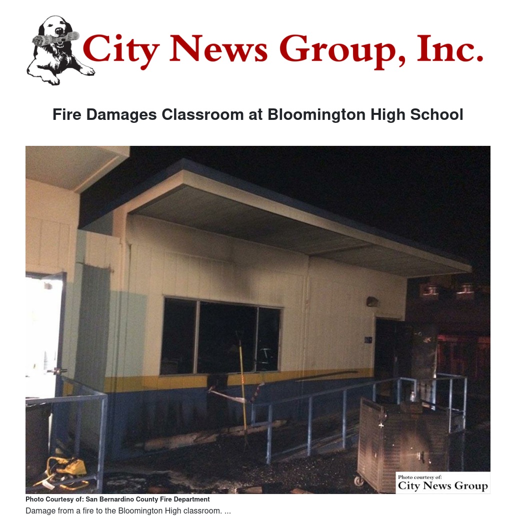 San Bernardino County Fire Investigators and San Bernardino County Sheriff Arson/Bomb were summoned to the scene to determine cause and origin of the fire. Earlier in the morning (0123 hours), SBCoFD responded to a report of trees on fire at Bloomington HS on a different portion of the campus. SBCoFD Investigators are looking into if these two fires are related. SBCoFD is working with Colton Unified School District to gather information and determine damage estimations.