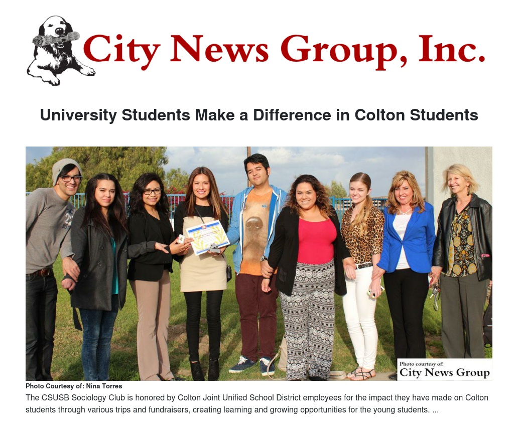 “The Sociology Club’s professionalism and activism in promoting leadership, mentorship and equal access to education contributes to the ideals and goals of Colton Joint Unified School District,” said Nina Torres, a counselor for Cooley Ranch Elementary and Woodrow Wilson Elementary schools who nominated the club for the award, at the May 6 school board meeting where the CSUSB students were honored.