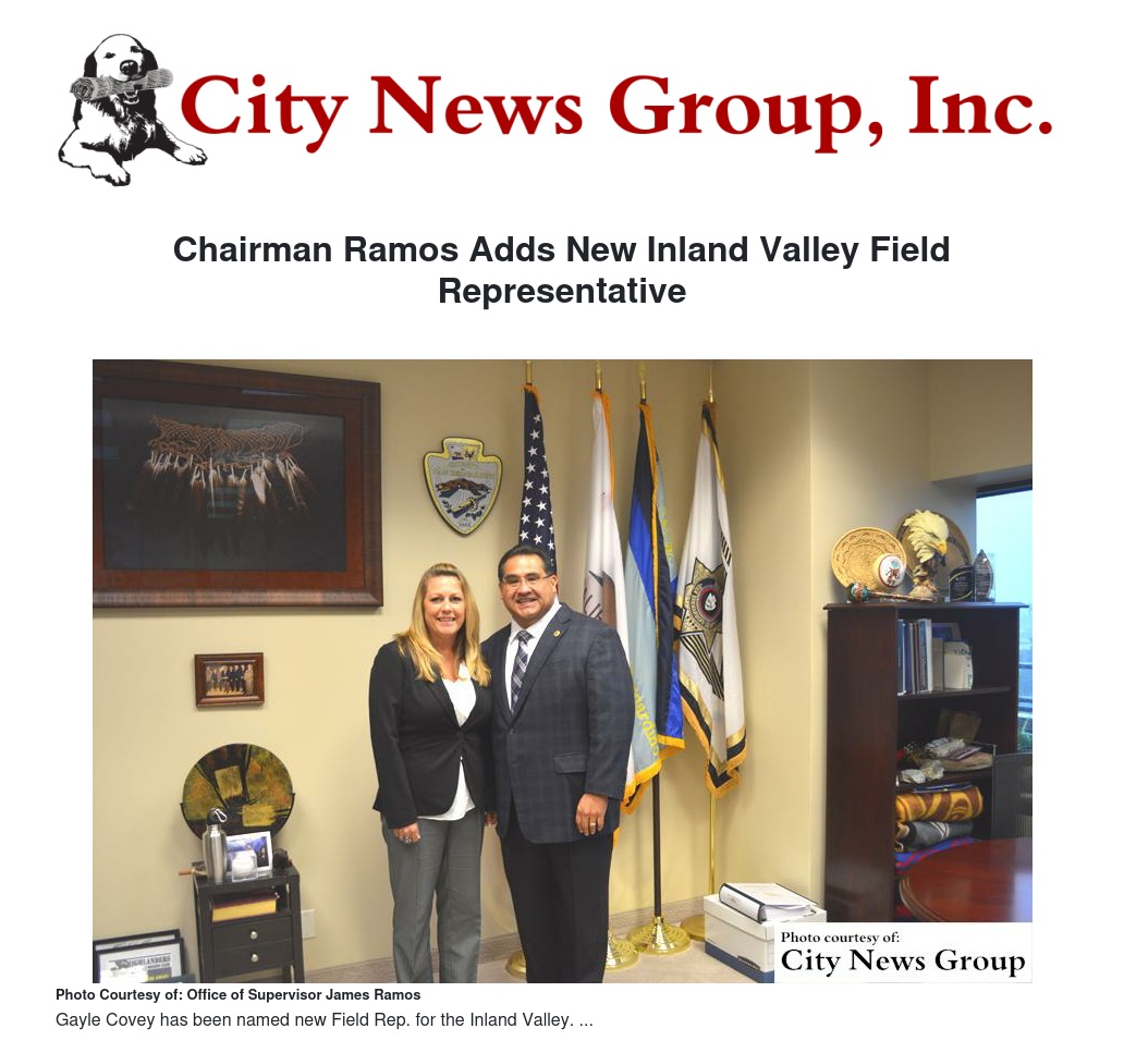 San Bernardino County Chairman James Ramos has named Gayle Covey as his new field representative for the Inland Valley.