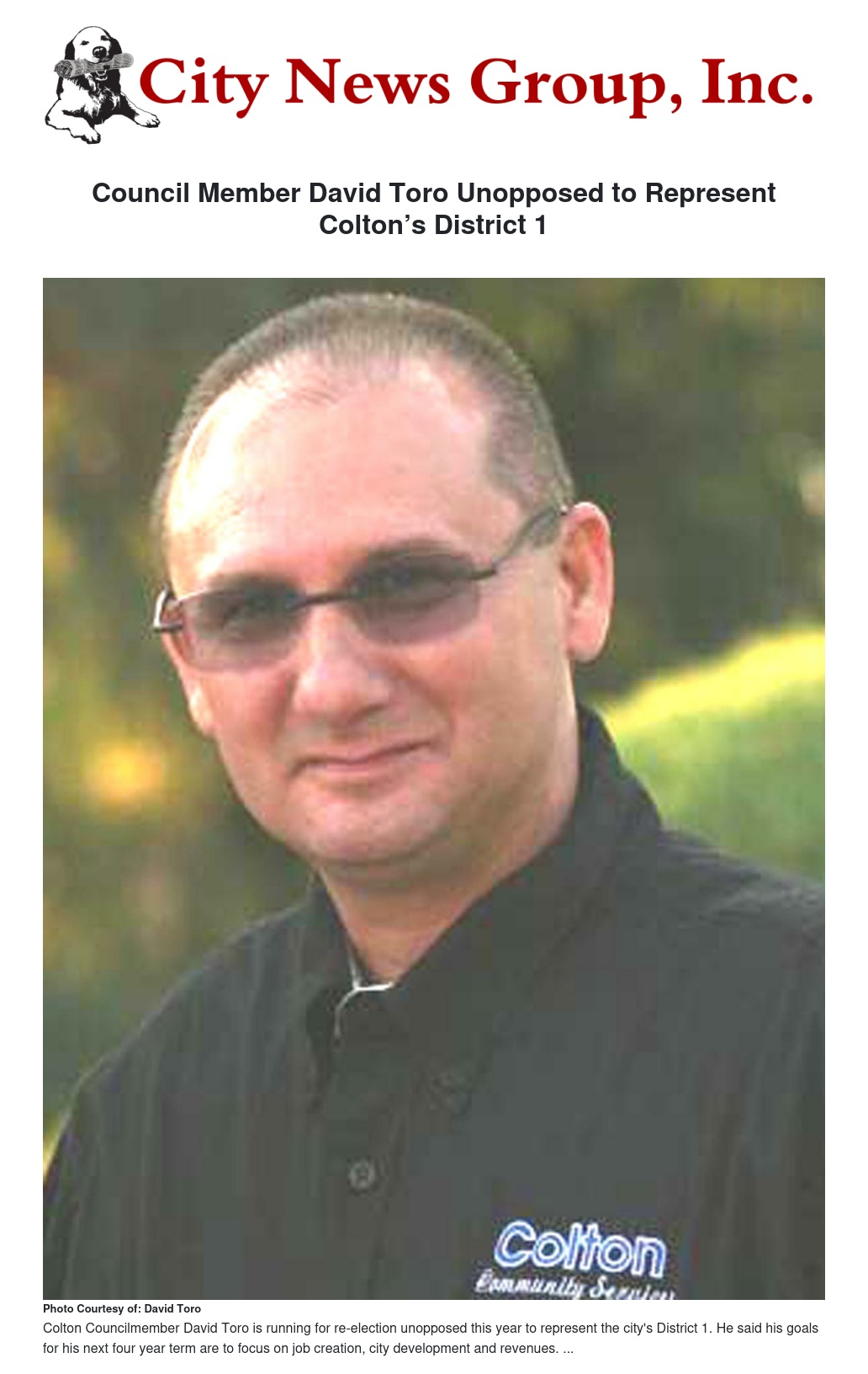 Colton City Councilmember David Toro is running unopposed and will be re-elected to represent Colton’s District 1 on the November 2014 ballot.