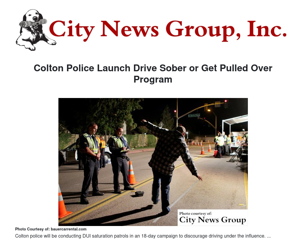 The Colton Police Department kicks off Friday night with special DUI Saturation Patrols. On Friday, Aug. 28, the Colton Police Deparment will deploy a DUI/Drivers License checkpoint in Colton and the DUI enforcement saturation patrols will continue through Monday, Sept. 7, with more DUI enforcement on various nights throughout the month.