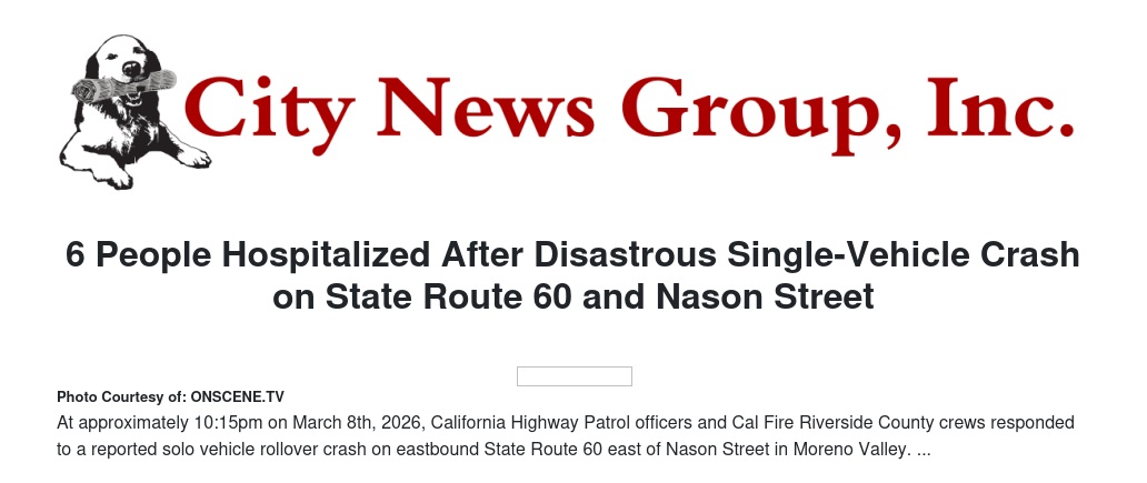 6 People Hospitalized After Disastrous Single-Vehicle Crash on State Route 60 and Nason Street by Eric Montgomery - City News Group, Inc.