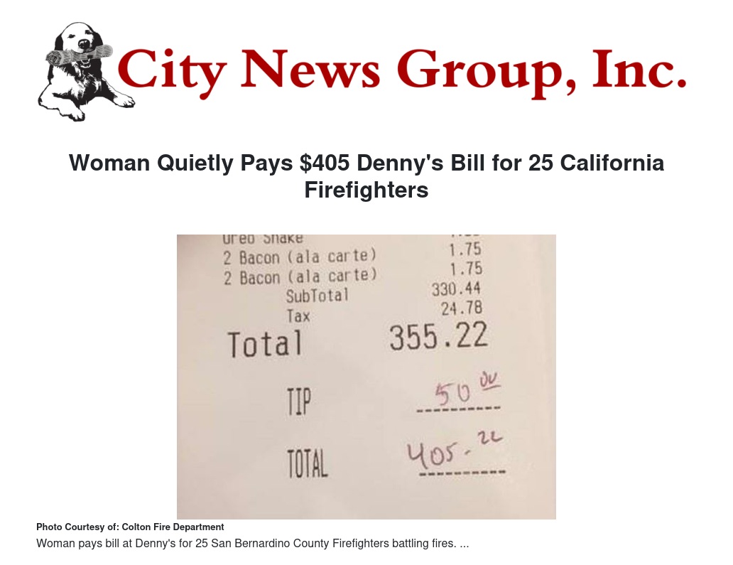 "While eating, an anonymous woman told the Denny's staff that she wanted to buy all of the firefighter's meals," the Colton Fire Department announced on Facebook. The bill for all of the meals, plus tip, came to a total of $405. The woman also bought a gift card for $100 to pay for desserts for the second wave of firefighters who were going to come to Denny's that evening on Valley Boulevard.