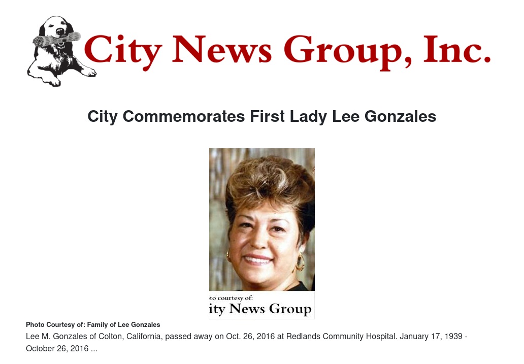 It states, "We, the mayor and members of the Colton City Council, extend our sincere condolences to the Gonzales family upon the loss of the beloved Lee M. Gonzales, a devout wife and mother, a caring citizens and recognized as the longest standing 'First Lady' of the City of Colton. In commemoration of her lifetime achievements, as a businesswoman and the wife of former Mayor Frank A. Gonzales, we honor her memory and positive contributions to family, friends and the citizens of this community."
