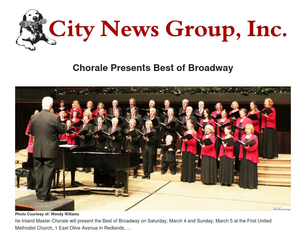 REDLANDS>> The Inland Master Chorale will present the Best of Broadway on Saturday, March 4 and Sunday, March 5 at the First United Methodist Church, 1 East Olive Avenue in Redlands.