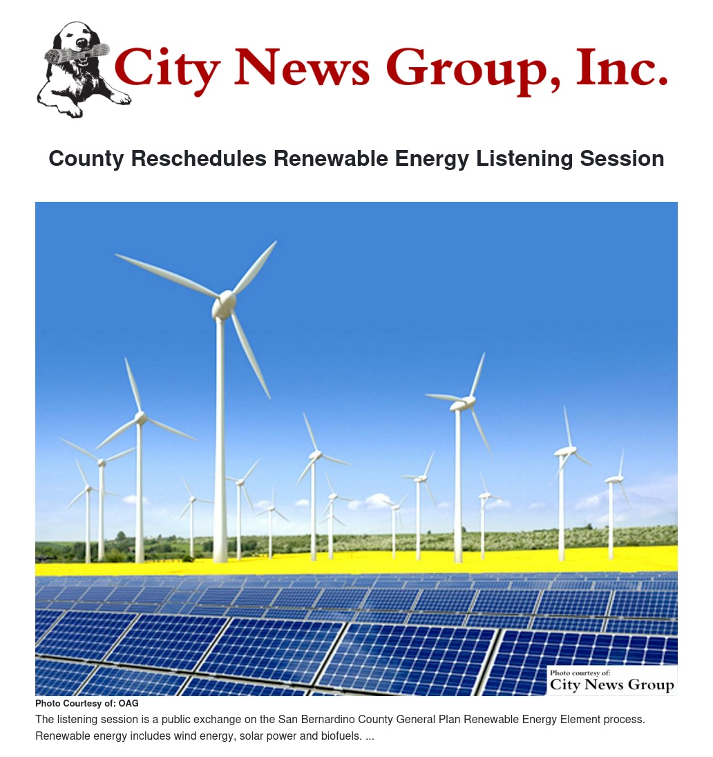 The listening session will focus on plans for the County General Plan renewable energy element and will be held in the Board of Supervisors Covington Chambers, County Government Center, first floor, 385 N. Arrowhead Ave. in San Bernardino San Bernardino, with opportunities for video conference testimony from both the High Desert (Hesperia) and Joshua Tree county government centers. The session will begin with an overview of the county's planning progress and priorities from County Planning Director Terri Rahhal, followed by public comments on the Element Framework and Outline.