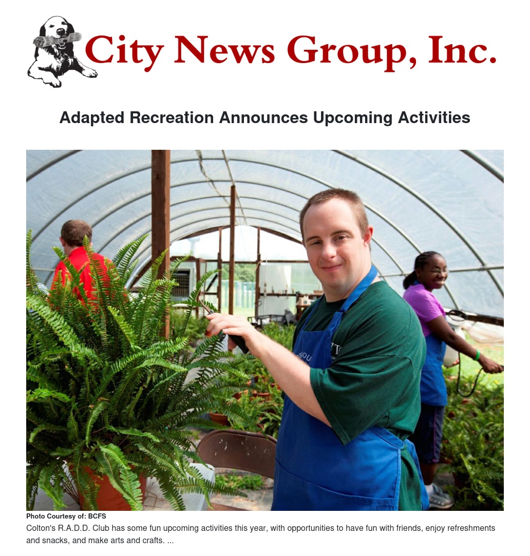 Colton's Recreational Activities for the Developmentally Disabled (R.A.D.D.) has several upcoming events in the new year. The program, which aims to provide a safe environment where individuals can engage in leisure time activities with friends and fellow club members, is open to those aged 18 plus and is gearing up for a busy 2014 with the following events: