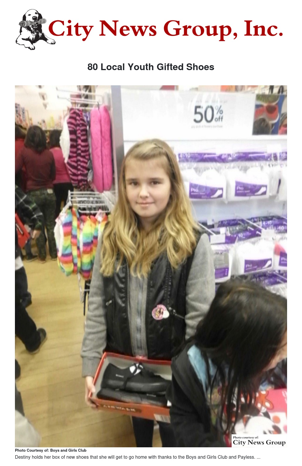 The Boys & Girls Club has partnered with Payless Shoesource’s Payless Gives Shoes 4 Kids international donation program since 2011 to give kids a new pair of shoes around the holidays. Each child and family was chosen by Boys & Girls Club staff to participate.