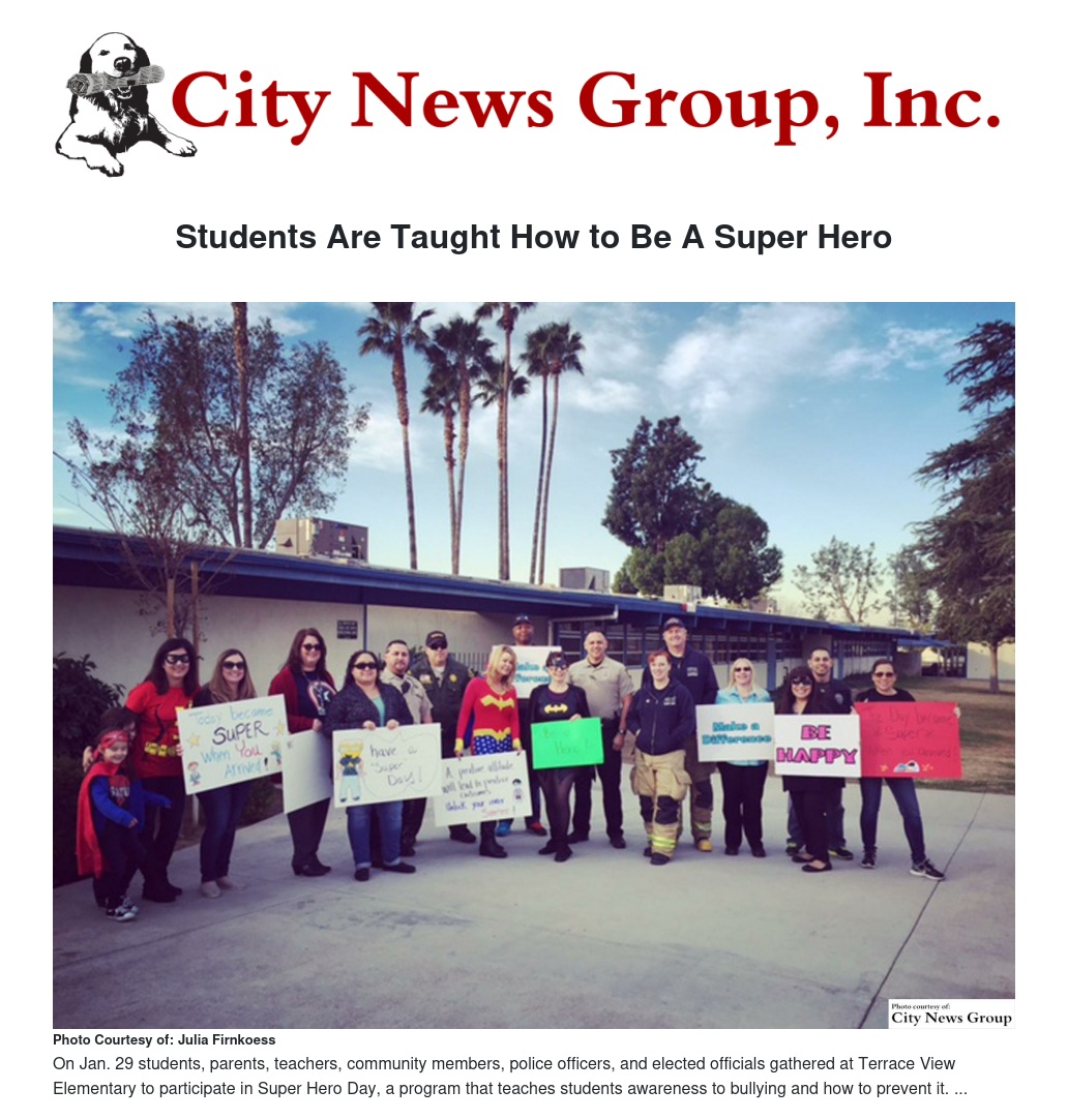 On Jan. 29 students at Terrace View Elementary arrived to school dressed as their favorite super heroes. These super heroes were welcomed with positive posters held by teachers, parents, Colton Unified School District (CJUSD) Board of Education President Pat Haro, Grand Terrace Mayor Darcy McNaboe, Grand Terrace Councilmember Jackie Mitchell, and Colton Police Department (CPD) officers Navarro, Carillo, Smith, and Yzaguirre. All had gathered as part of the Super Hero Day Program.