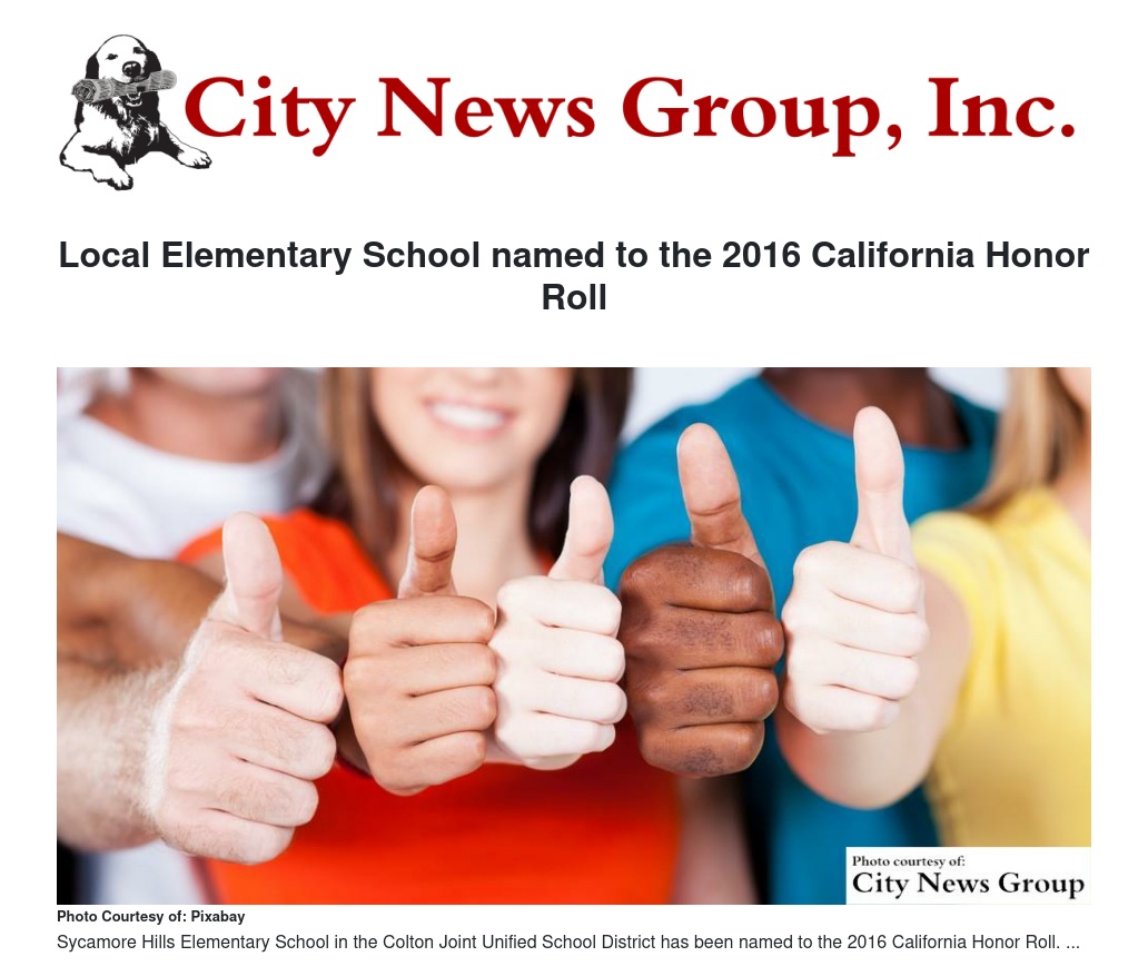COLTON>> Sycamore Hills Elementary, of the Colton Joint Unified School District, has recently been named to the 2016 California Honor Roll by the Education Results Partnership and the Campaign for Business and Educational Excellence.