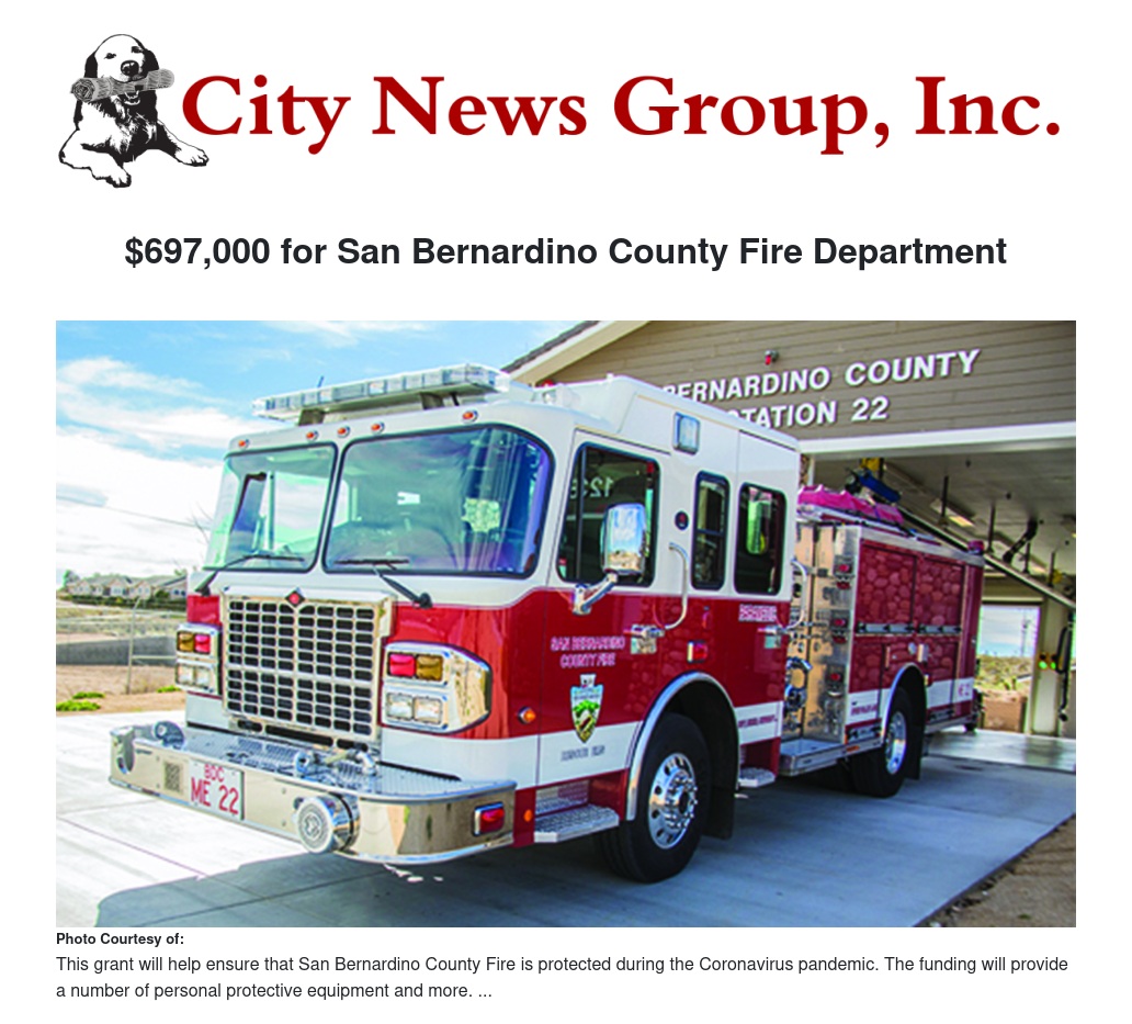 On July 7, 2020, Rep. Pete Aguilar announced the San Bernardino County Fire Protection District (SBCFPD) has received $697,072 from the Department of Homeland Security (DHS) Assistance to Firefighters Grant-COVID-19 Supplemental (AFG-S) Program. The funding will allow the San Bernardino County Fire department to purchase personal protective equipment (PPE), including respiratory protection, face masks, eye protection, and protective coveralls. The equipment will allow firefighters and first responders to continue their work safely during the coronavirus crisis.
