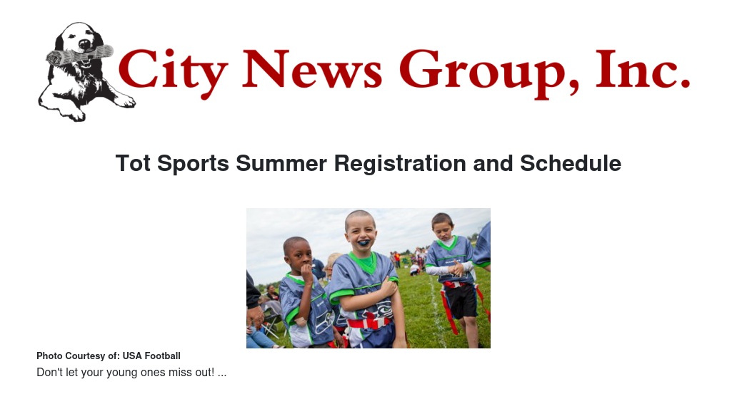 Get the little ones involved in sports this season! Flag Football is held on Saturdays starting Sept. 6 through Oct. 11. Game time is from 10 to 11 a.m. at Dauer Park.