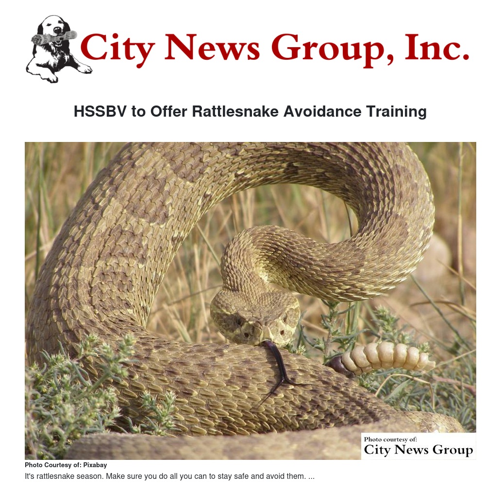 The Humane Society of San Bernardino Valley will be hosting Rattlesnake Avoidance Training on Friday, May 13 at their facility starting at 9 a.m. Training is provided by High on Kennels from Santa Ysabel, CA. Interested participants can pre-register and save $5 off of the $75 fee.