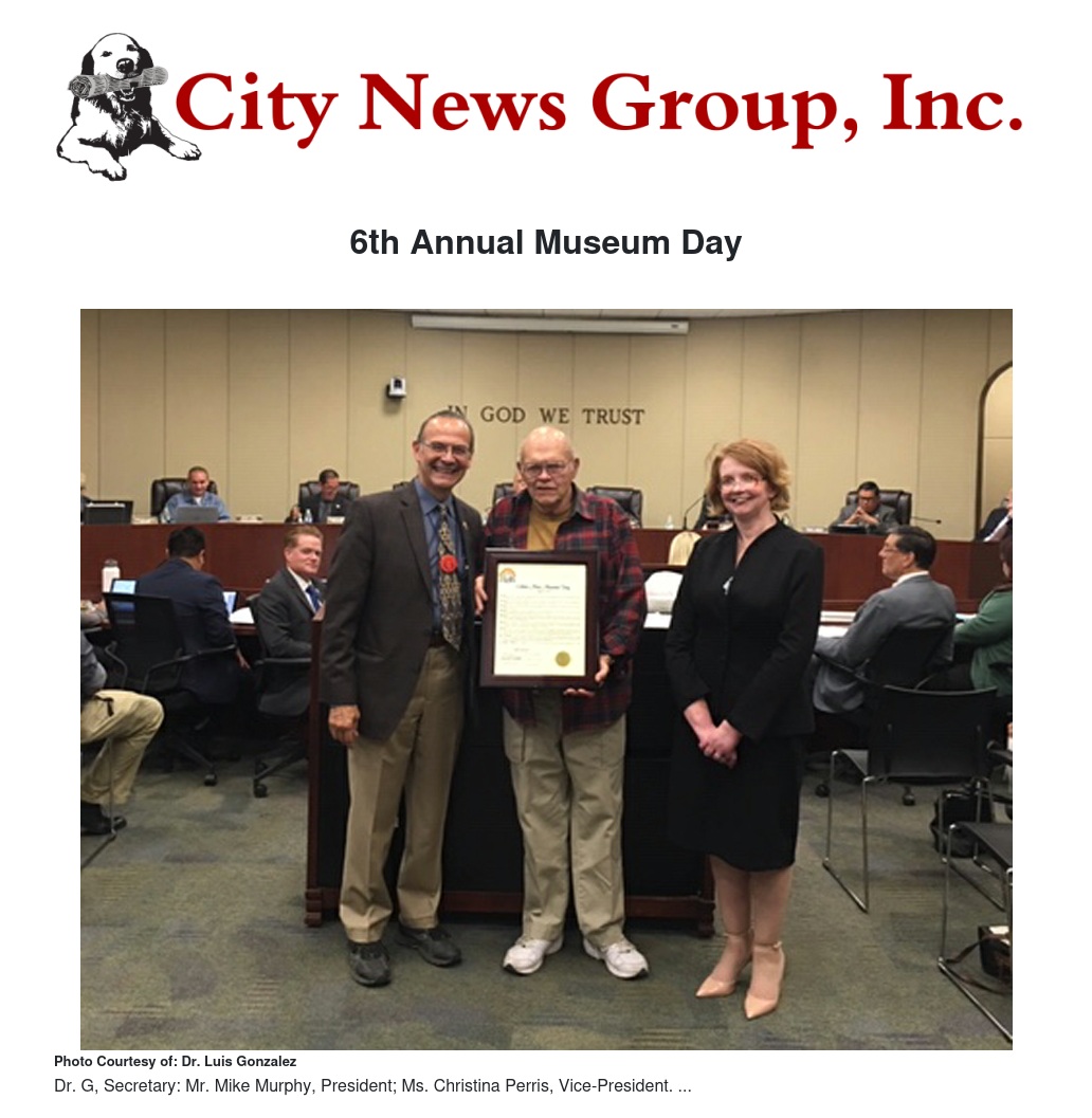 The CAM Board of Directors appreciate the support of the Colton City Council who has once again recognized the museum program with a proclamation honoring the CAM Museum Day. Members of the Board include Mr. Mike Murphy, President, Ms. Christina Perris, Vice-President, Dr. G (Dr. Luis S Gonzalez), secretary, Marian Murphy, treasurer and board members, Chuck Vasquez, Frank Acosta, and Jimmy Villegas.
