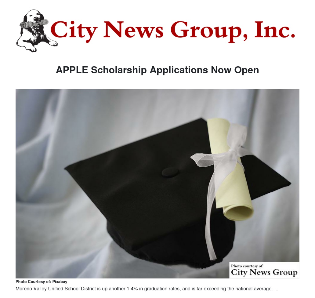COLTON>> The APPLE Scholarship Foundation is now accepting 2017 scholarship applications. Starting now through Sunday, April 16, students who plan to attend community college or a four-year university or who also plan to pursue post-secondary vocational training may apply.