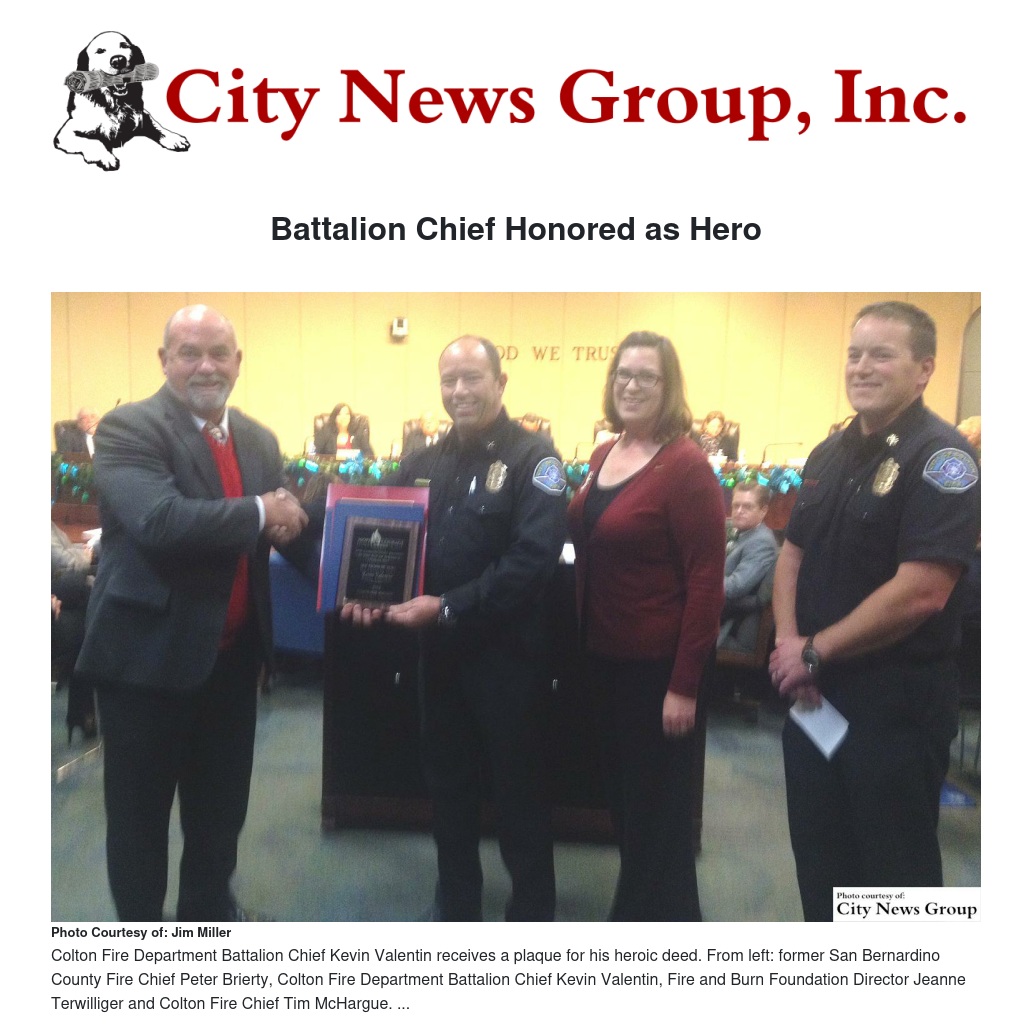 The Colton City Council on Tuesday, Dec. 16 invited the Fire and Burn Foundation to present the Courage Award to Battalion Chief Kevin Valentin for his courageous action in the line of duty.