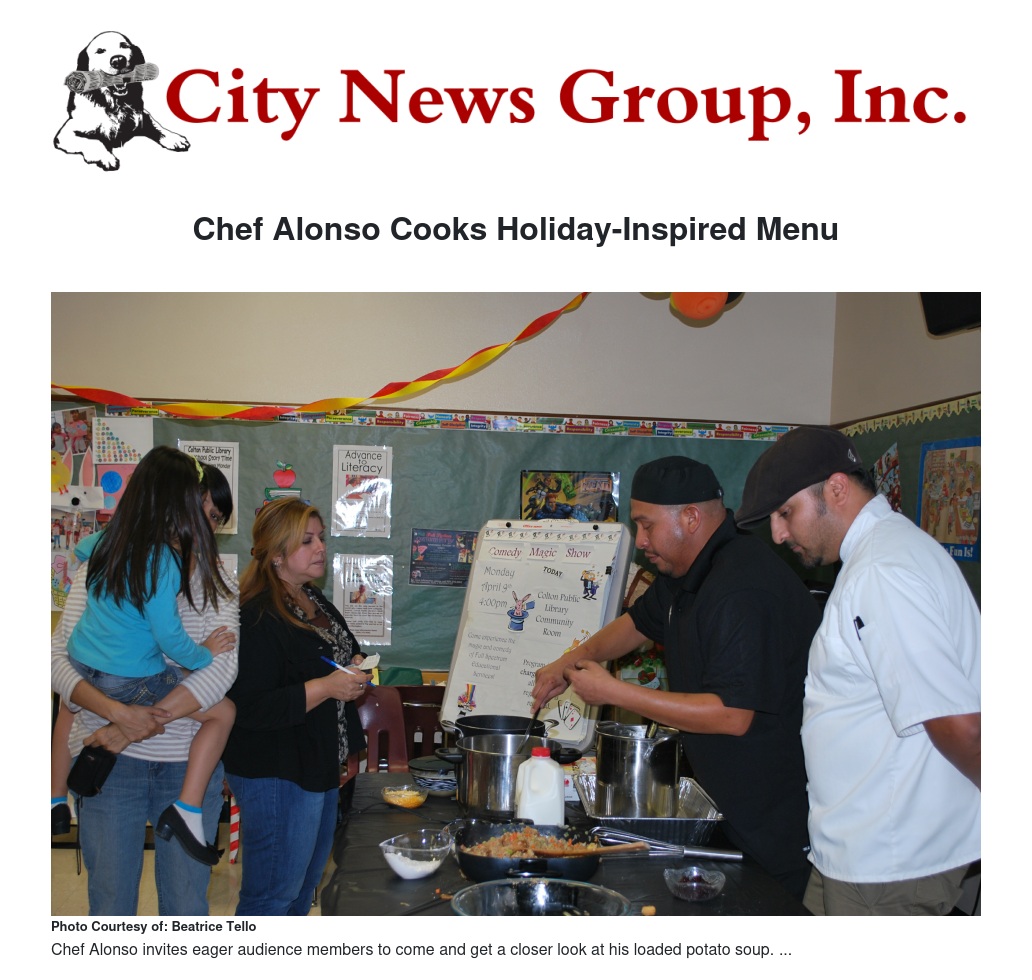 Having held over 14 cooking demonstrations in the past three years, Chef Alonso has been a regular attraction at the Colton Public Library. Louie Trejo, a frequent audience member at Chef Alonso’s demonstrations, said, “I always try to come out to the cooking classes whenever I can. I’m ready to eat!”